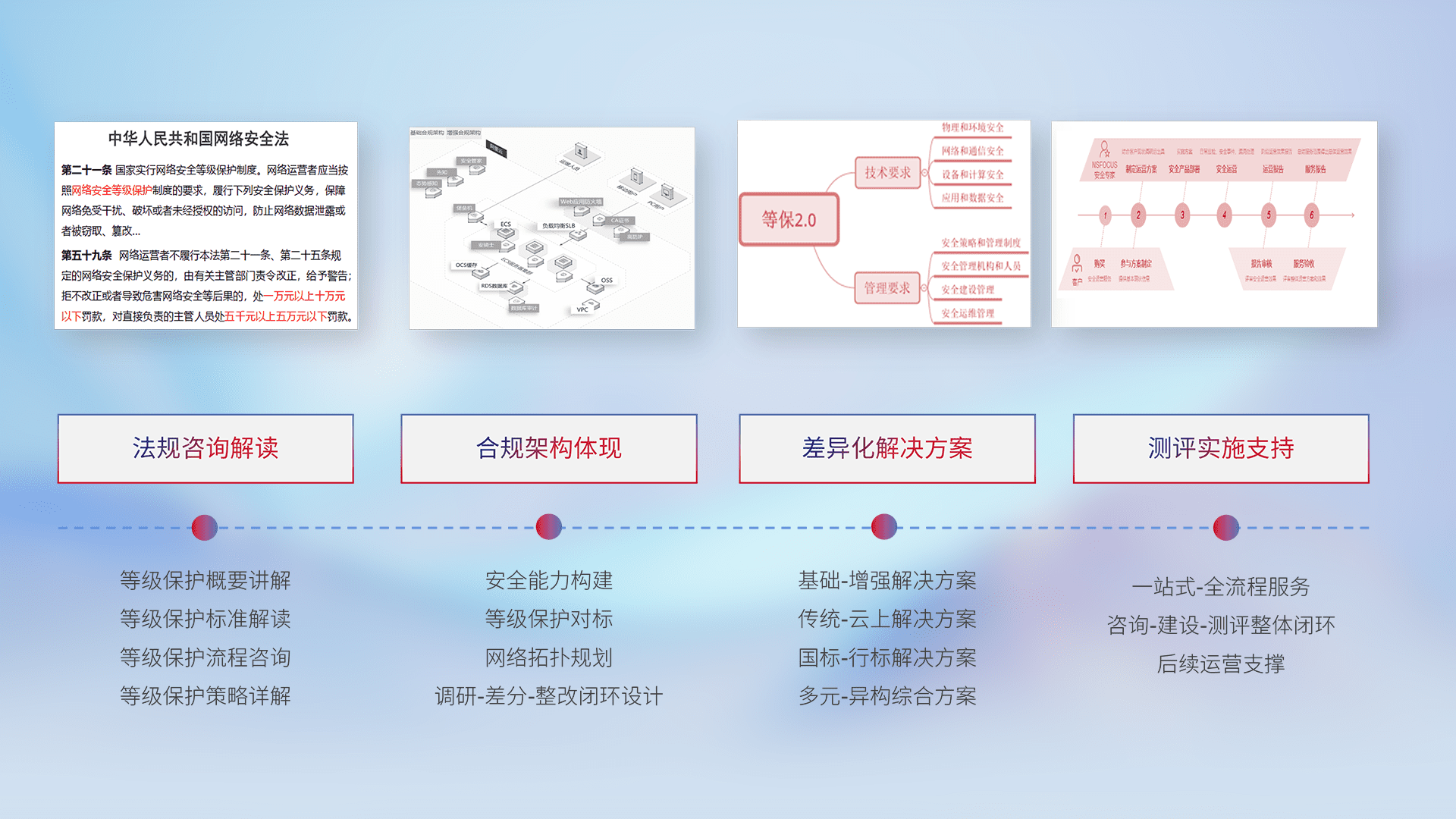 通过专业的法律咨询解读、、、、合规架构体现、、、差异化解决方案、、测试实施支持等服务,,为客户量身打造等保合规体系。。。